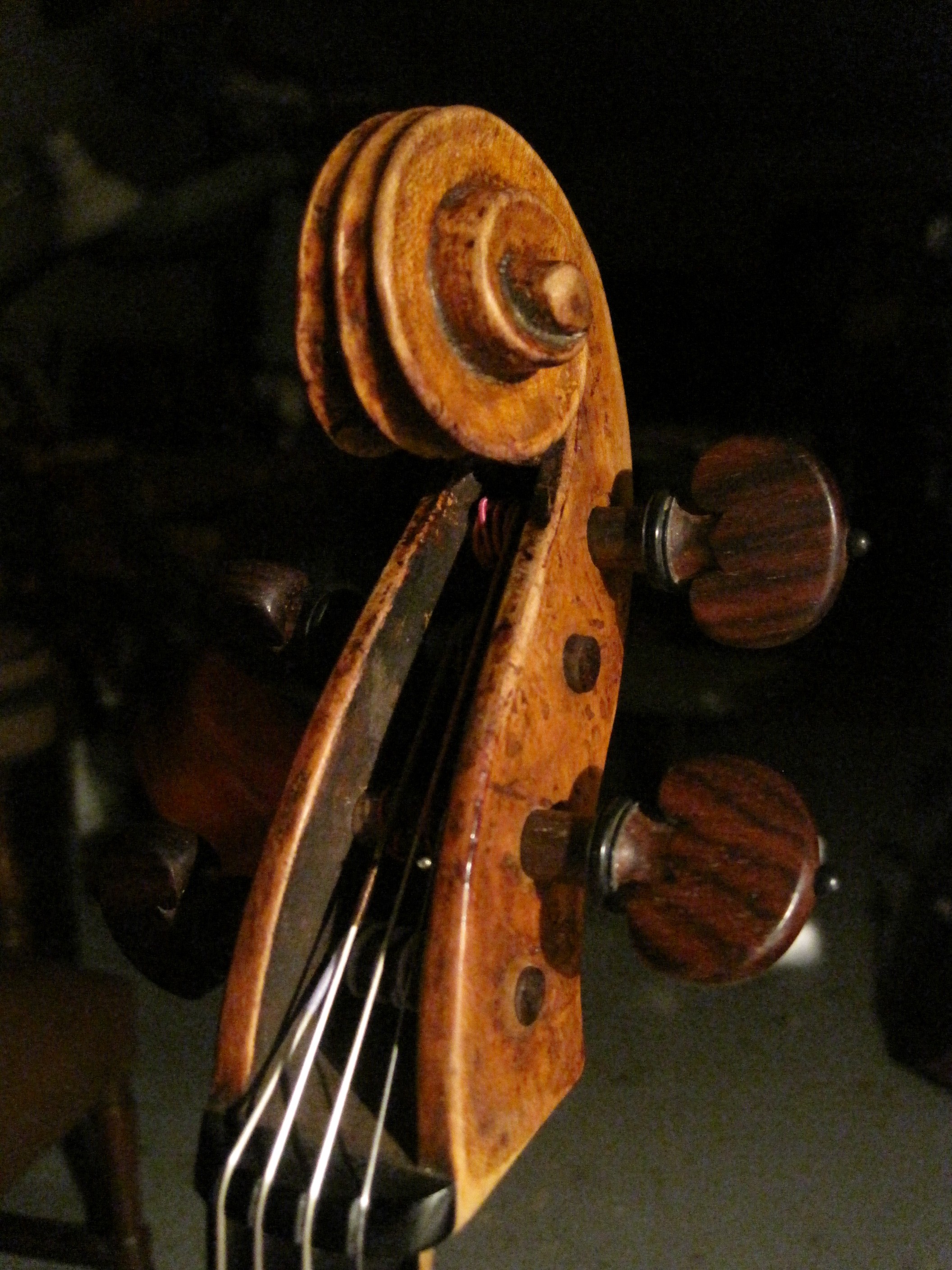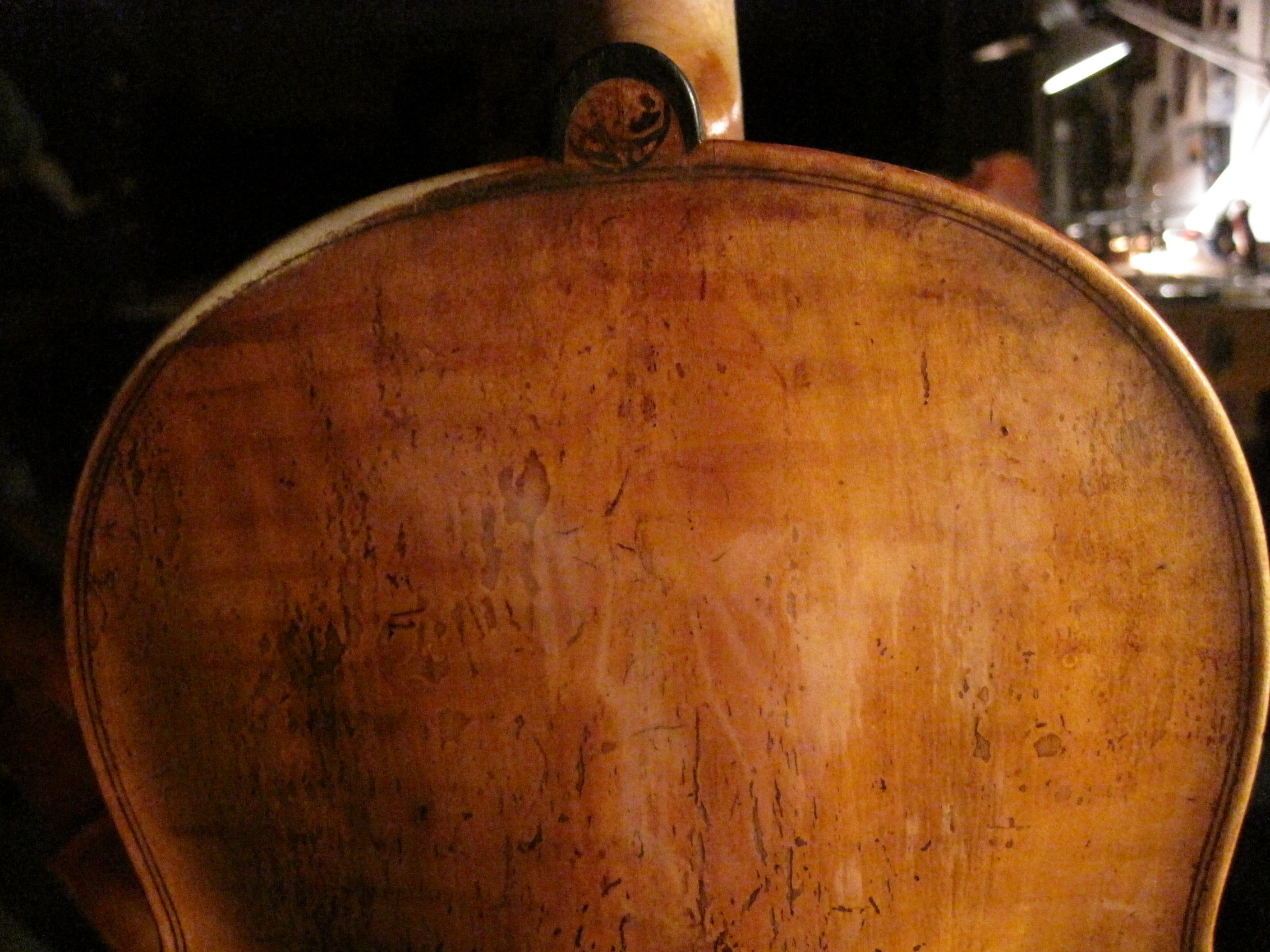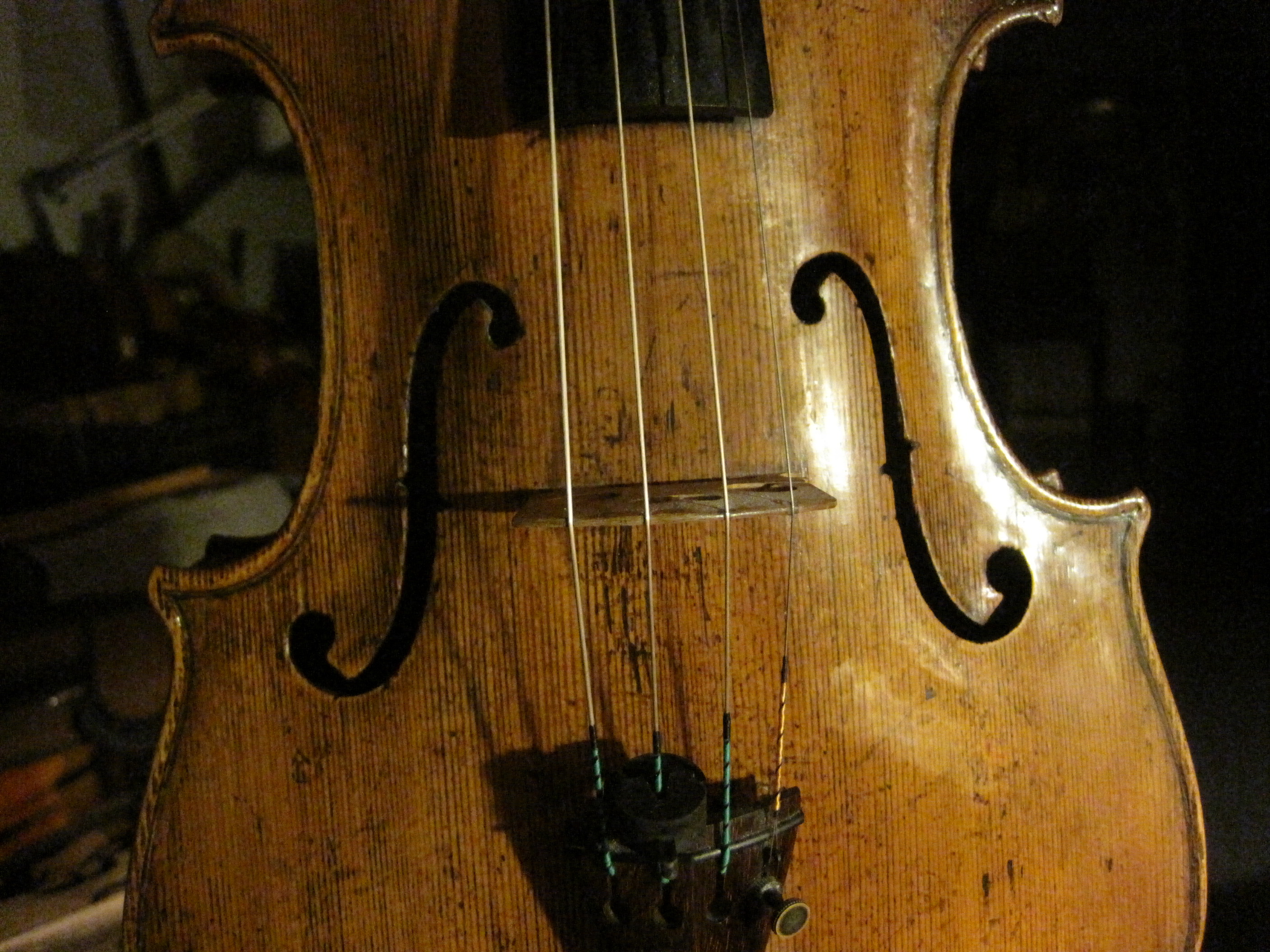 The bold, openly cut F-hole shows him working rather quickly and the photo hints at the strong,robust arching that gives this viola such power . Also evident is the tight grained spruce with the typical clear, yellowish varnish for which the Testore family are justly renowned for. Taken all together it is a wonderful example of bold instrument making, made efficiently for working musicians by artistic hands with personal and local style with ,above all , real life in its grain